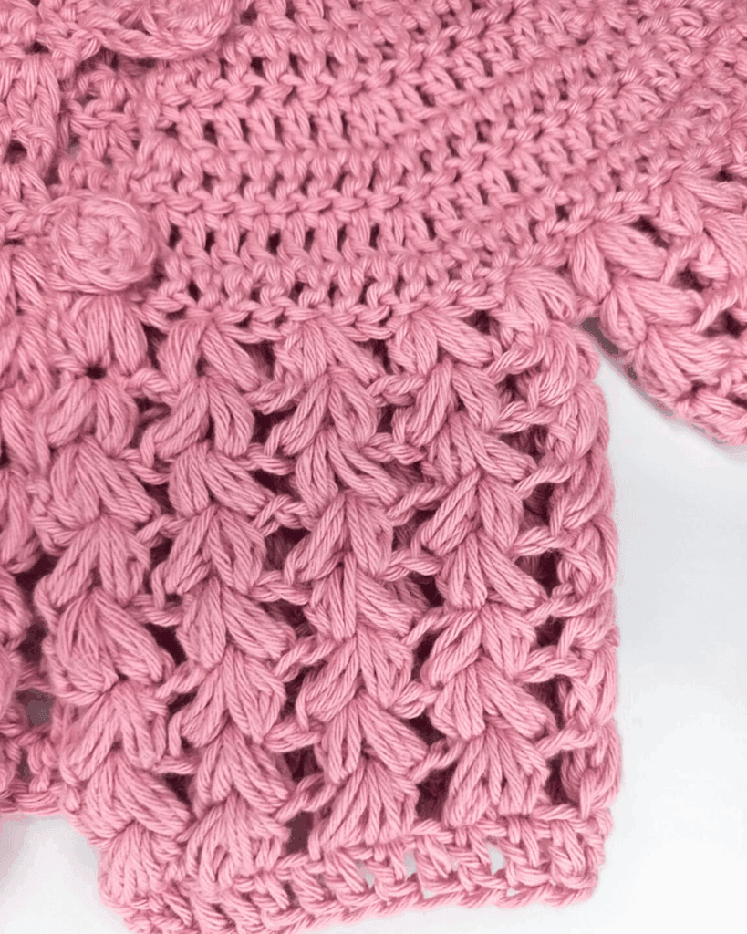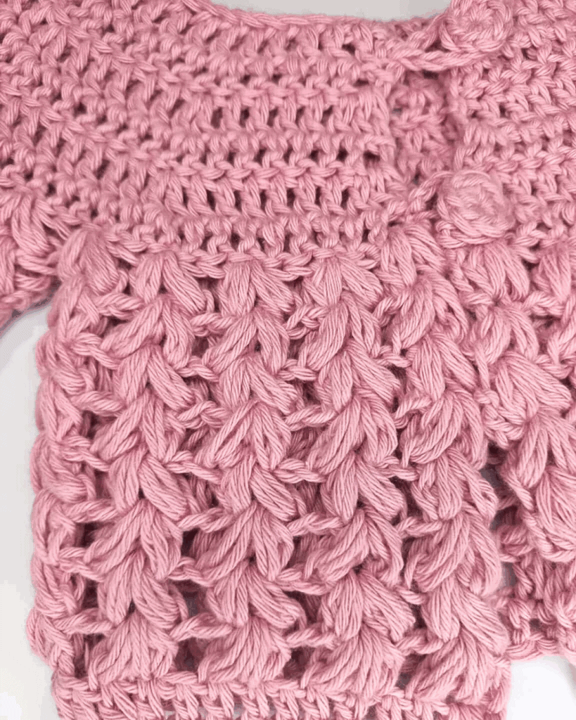 I suggest practicing the puff stitch before taking on this project. And once you’ve built that confidence, you can crochet this sweater in 4-5 hours for a small size!