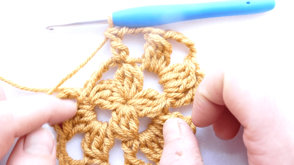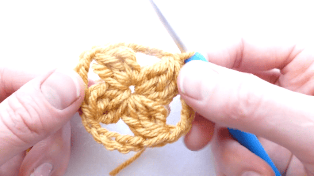 Round 5: ch6. Skip 3sts and dc3tog into the top of your next dc from round 4. Ch3 and dc3tog again in the same st. Ch3, Dc3tog into the corner, ch4, and dc3tog in the same corner.