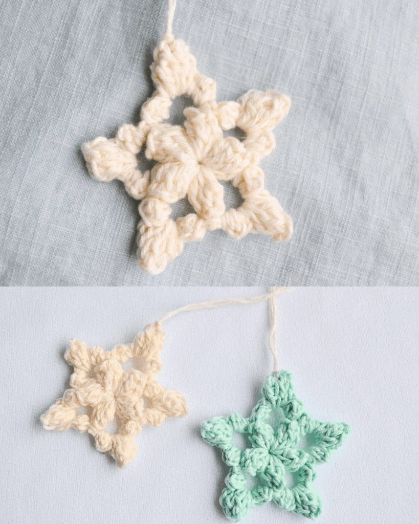 And that’s it! For my white snowflake, I used Cotlin yarn from Wecrochet. This yarn gave the project a nice natural look. By using a relatively small hook, I was able to get these stars to keep their shape well without the starching that is often done with traditional crochet ornaments.